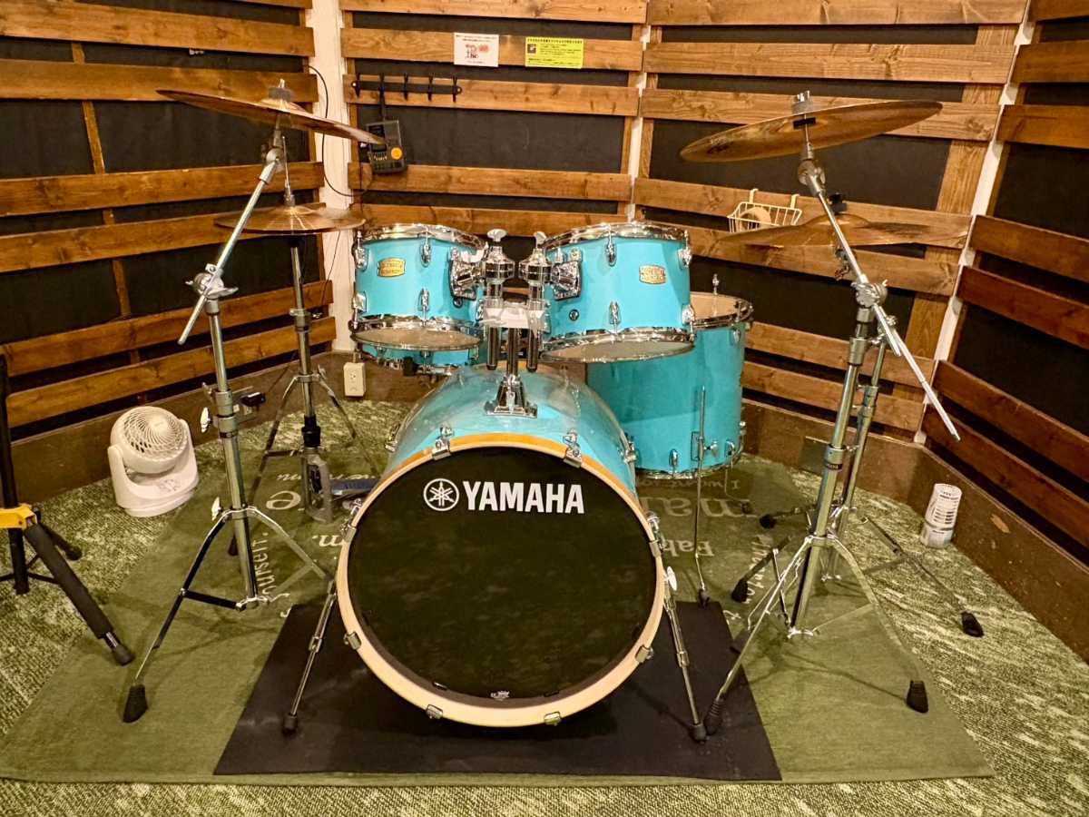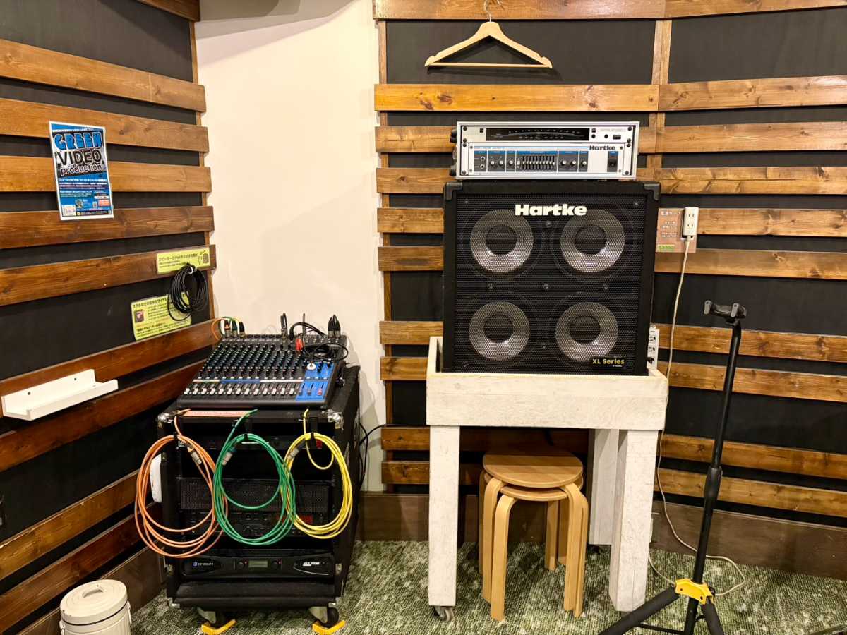 Marshall・VOXのギターアンプ、HARTKEベースアンプ、YAMAHA Stage Custom Birchドラムを常設。